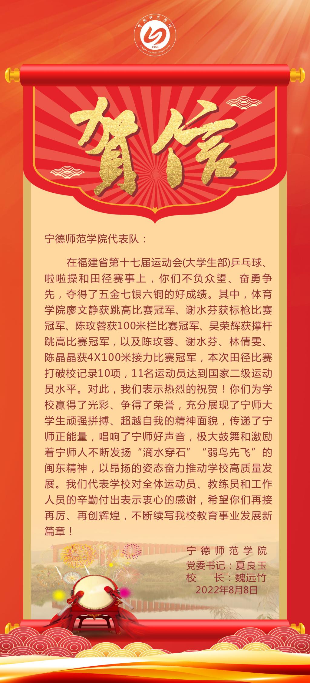 贺信:祝贺必赢官网代表队在福建省第十七届运动会(大学生部)中勇创佳绩