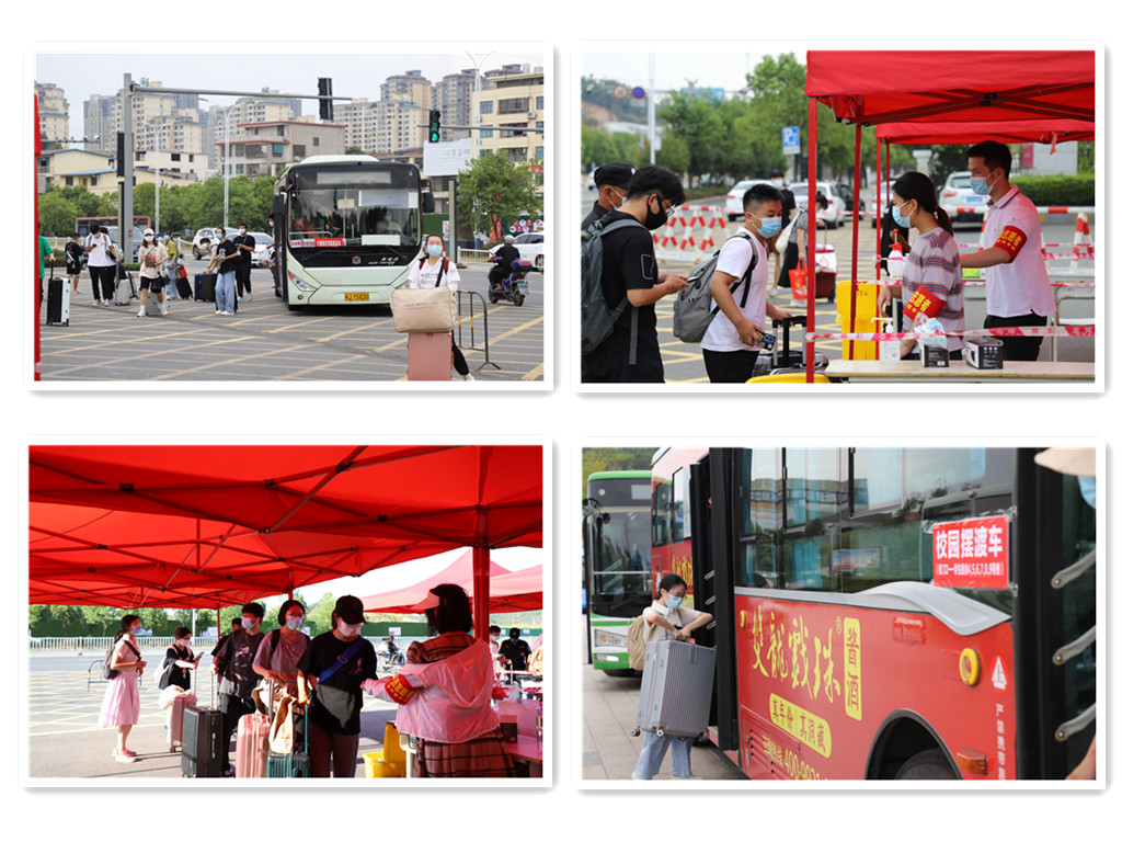 根据疫情防控要求,学校在返校现场设置了体温检测、查验健康码、行李消毒、人脸识别核验等程序,志愿者、安保人员、后勤人员指导车辆分流,引导学生有序入校。在完成所有查验后,学生可搭乘校内摆渡车返回宿舍。