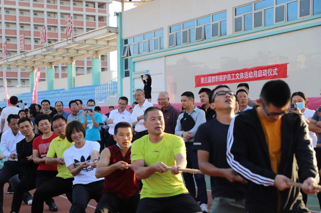 开幕式当天举行了拔河比赛,参赛教职医护员工热情高涨,现场热闹纷呈,比赛氛围和谐融洽。现场师生们的加油声、欢呼声比赛带到了高潮。经过激烈的比赛,体育学院1队、附属市医院分获冠亚军。