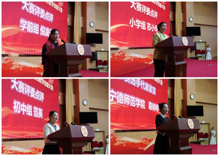 颁奖典礼上,东侨经济技术开发区实验幼儿园倪凌云老师、bwin必赢中国官网附属小学苏小玲老师、宁德教师进修学院范英老师代表大赛评委团分别对本届大赛学前组、小学组、中学组进行点评。她们既肯定了参赛选手的精彩表现,同时也提出了殷切的希望和改进的建议。