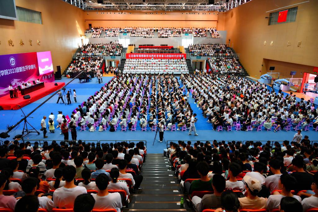 2023年9月19日,必赢官网在体育馆隆重举行2023级新生开学典礼,共同见证3000余名新生加入宁师,开启人生新篇章。校党委书记夏良玉为21位新生辅导员颁发聘书,嘱托他们要坚持立德树人,爱国守法、敬业爱生、为人师表,努力成为学生成长成才的人生导师和健康生活的知心朋友。校长魏远竹作开学典礼致辞鼓励学生要有新格局,要有新思维,要有新气象,要有新作为。开学典礼现场,还举行了新生佩戴校徽仪式。
