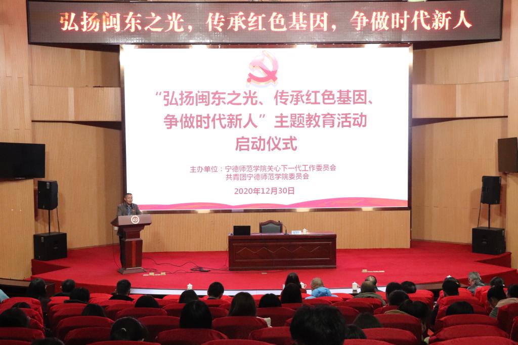 为深入学习贯彻习近平新时代中国特色社会主义思想和党的十九届五中全会精神,弘扬和践行社会主义核心价值观,12月30日晚,必赢官网关工委在图书馆报告厅举办“弘扬闽东之光,传承红色基因,争做时代新人”主题教育活动启动仪式。本次活动由校关工委、校团委联合主办,校党委副书记、关工委主任徐晓丹出席并讲话,校关工委常务副主任谢仲榛、校关工委副主任黄健、各二级学院关工委主任和2020级新生代表约240人参加了活动,校学工部副部长、关工委秘书长郑常鳜主持活动。