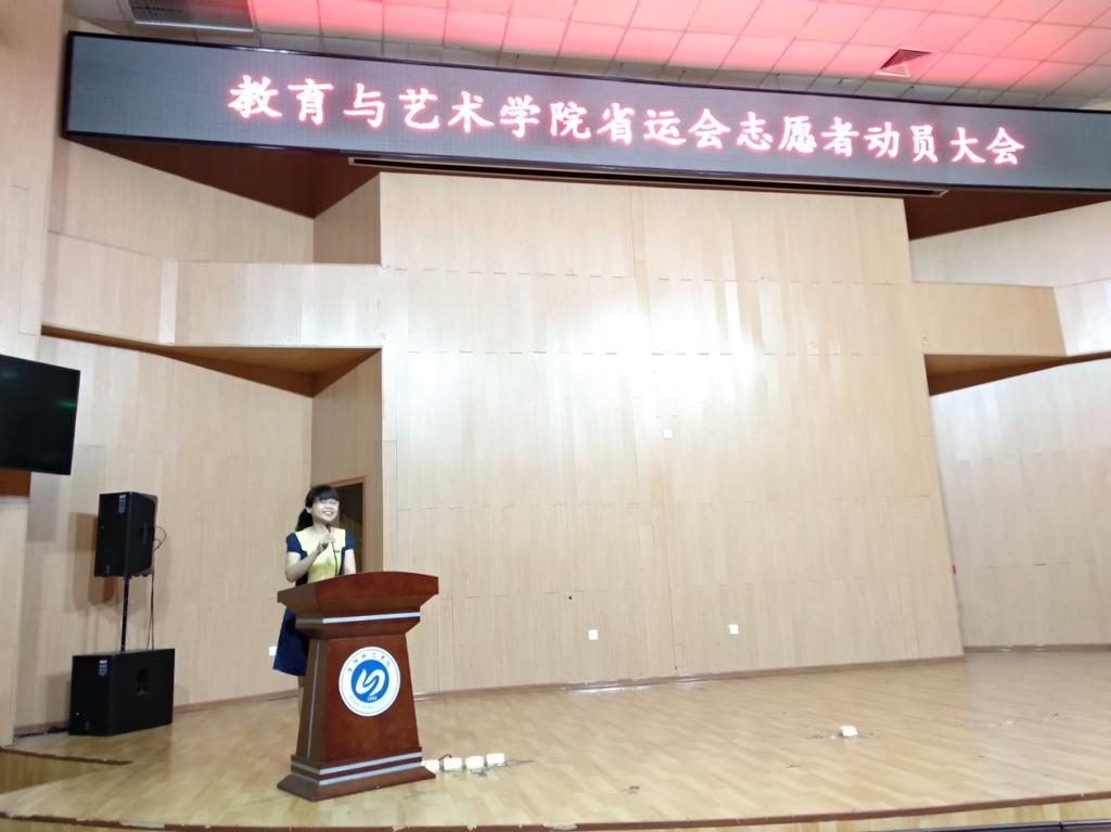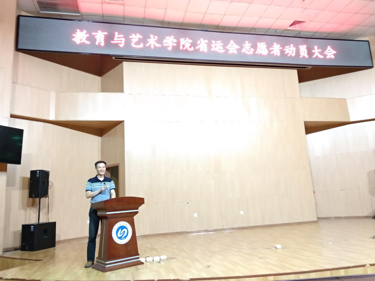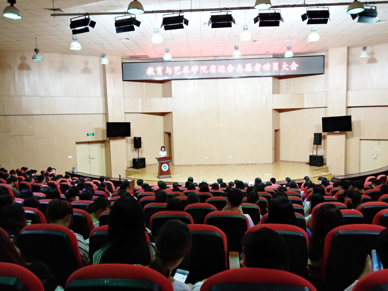 为深入推进青年志愿者服务工作, 7月7日晚,教育与艺术学院在东侨校区图书馆报告厅举行省运会暑期集训动员大会。院党委书记丘怡、院长赵峰、副书记陈贵新、马克思主义学院党委副书记廖翔华、助排教师徐艳、系主任、辅导员及328位演员志愿者们参加大会。此次大会由院团委书记黄丽艳主持。
