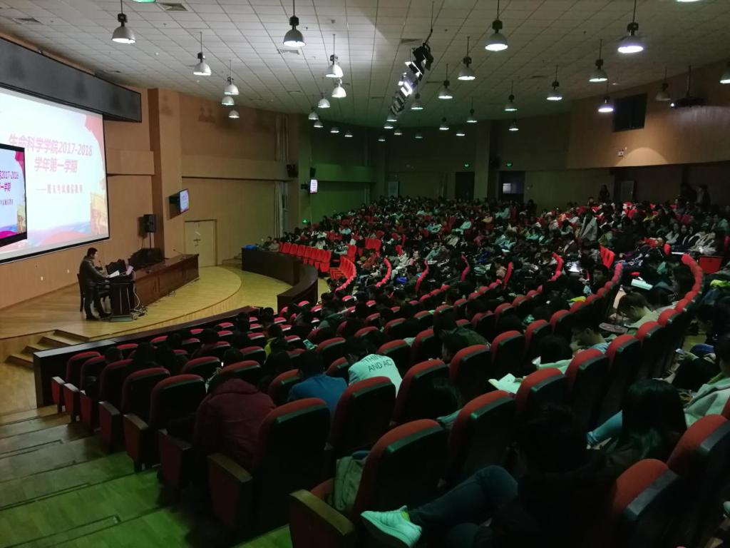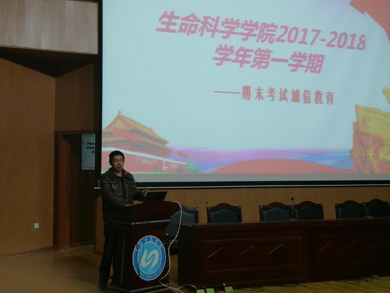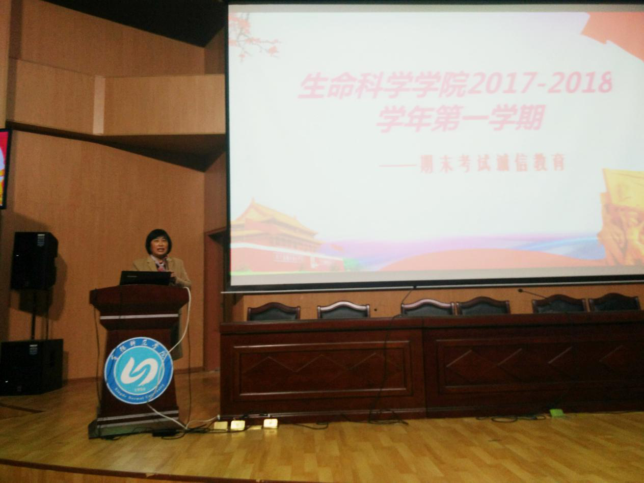 2018年1月2日下午生命科学学院在图书馆报告厅开展“期末考试诚信教育”动员大会,出席本场大会的有生命科学学院党委书记陈爱平、学工办主任王楠楠老师以及各年级辅导员。生命科学学院2015级、2016级、2017级的同学们参加了动员大会