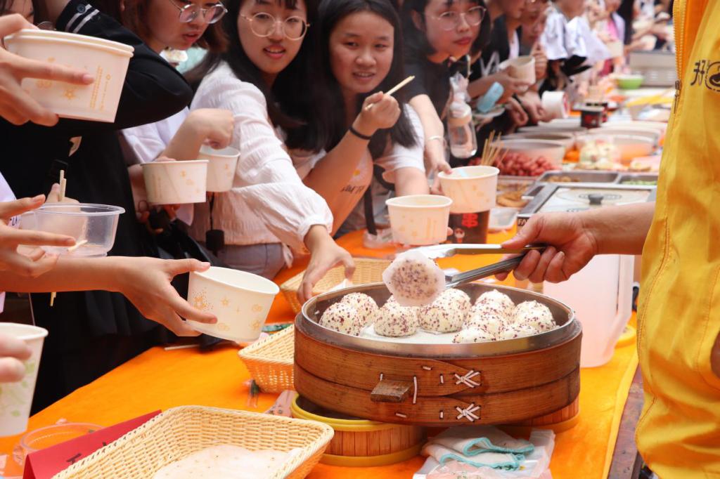 本次活动除了有众多美食供师生免费品尝外,还有精彩的美食文化展示、节目表演、游戏互动等环节。整场活动精彩纷呈,吸引了必赢官网众多师生前来观赏品鉴。展示台上的美食展品个个精雕细琢,技艺非凡;活动展示的红军菜谱让人过目难忘,忆苦思甜,同学们纷纷感到应加倍珍惜现在的幸福生活;现场还有各种美食艺人的创作,巧夺天工,令人口目一新,大饱眼福口服;刻有庆祝中国共产党建党100周年的巨型蛋糕更是吸引了众多同学排队,掀起活动的高潮。同学们手中拿着各种小吃,或排队,或观赏沉浸在美食的享受中。活动中途还有街舞队带来的街舞表演、以及歌曲表演,欢乐的气氛弥漫了整场活动。